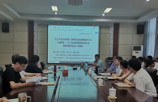 申兆亮结合《新时代师德规范》、《新时代高校教师职业行为十项准则》、《关于高校教师师德失范行为处理的指导意见》《304永利集团官网入口教师师德考核办法》等师德师风建设相关文件对全体教职工进行宣讲,重点从思想政治方面、学术道德方面、教育教学方面、生活行为方面、廉洁自律方面等讲解了304永利集团官网入口师德负面清单,并结合违反高校教师职业行为十项准则典型案例对师德失范行为处理进行了深入剖析。