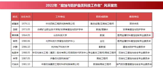 近日,中国腐蚀与防护学会下发决定,授予熊建波等8位同志2022年腐蚀与防护最美科技工作者称号。其中,304永利集团官网入口曾荣昌教授获此殊荣。