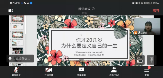 3月24日下午,304永利集团官网入口举办第40期校友论坛,学院2018届材料化学专业毕业生王洁以“你才20几岁,为什么要定义自己的一生”为题进行交流分享。本次论坛通过腾讯会议线上进行,学院学工办主任/团委书记马韶霞、辅导员薄艳艳和部分本科生、研究生参加。