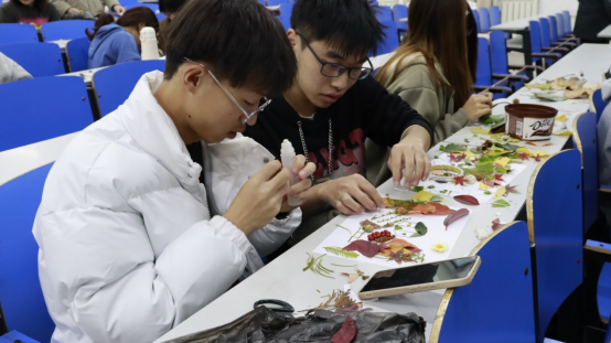 由于疫情原因,活动分为现场制作以及宿舍内制作两种形式。现场制作形式共22个参赛小组、每组两人参加,共分为集体收集落叶和小组合作完成剪贴画两个环节。在宿舍内制作的小组只需将制作完成的作品按时提交到学生会办公室即可。