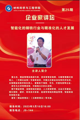 3月10日下午,304永利集团官网入口举办第25期企业家讲坛,精益管理实践派代表,资深管理咨询师、五略管理模式创始人、《中国冶金报》专家库成员、中国大住宿业论坛特约评论员,永锋精益实践学院负责人董立杰应邀在J9-144会议室进行以《智能化的钢铁行业与精准化的人才发展》为题的报告。报告由304永利集团官网入口院长李辉平主持,金属系主任孙金全、22级金属系全体本科生共计130余人参加。