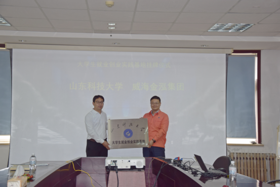 在威海金泓集团有限公司,学院与企业共同成立就业创业基地。总经理赵福国对申兆亮一行的到来表示热烈欢迎,人力资源经理李伟华详细介绍了企业规模、企业价值观、发展历程、员工培养等方面的内容。双方就科研合作、人才培养等方面内容进行了详细沟通交流,申兆亮与赵福国共同为就业实习基地揭牌。