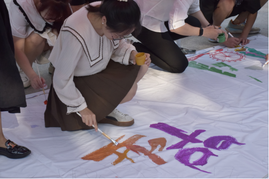活动过程中,教师代表及毕业生代表们积极参与,用心描绘出“我们毕业啦”等文字,绘制了鸽子、304永利集团官网入口标志性建筑等图案,进行了创意涂鸦和留言,部分同学还留下了彩色手印,现场创意无限,充满欢声笑语。绘制完成后,作品将在J2号楼东侧进行展示。