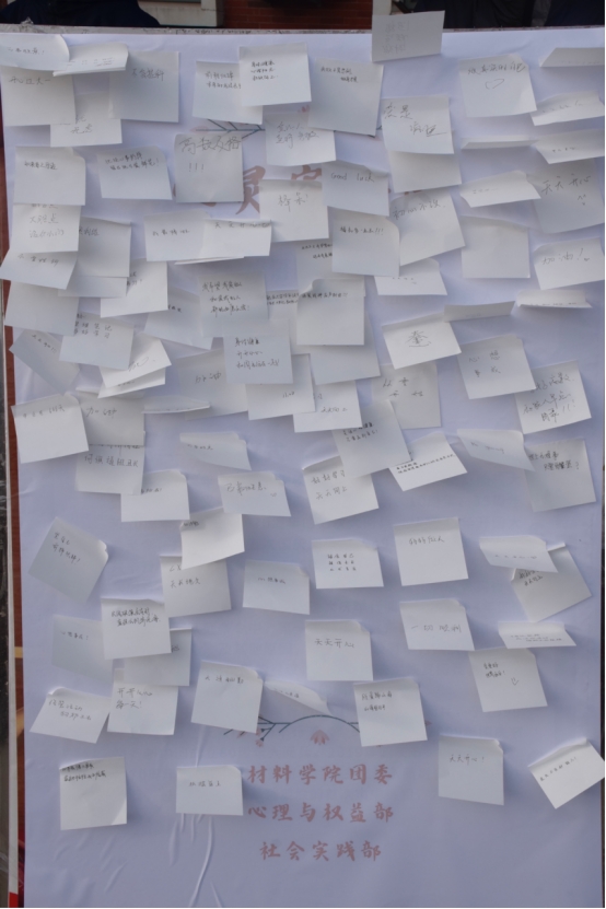 本次测评设有三个活动区:心理测评区、心灵寄语区、心理知识抽奖区。每个活动区都设立了测评点,各测评点放置有一定数量的心理咨询预约流程传单,需要者可以自行领取。参与者首先要在心理测评区领取一套量表进行答题,由测评组人员进行分析。接下来,参与者需要到心灵寄语区领取便利贴,写完后贴在展板上。最后,在工作人员的引导下,参与者进行心理知识答题并抽奖。按照顺序依次完成三个活动为一次完整的测评。在整个活动过程中,同学们能够做到积极配合、认真作答,显示出同学们对心理工作的重视与支持。