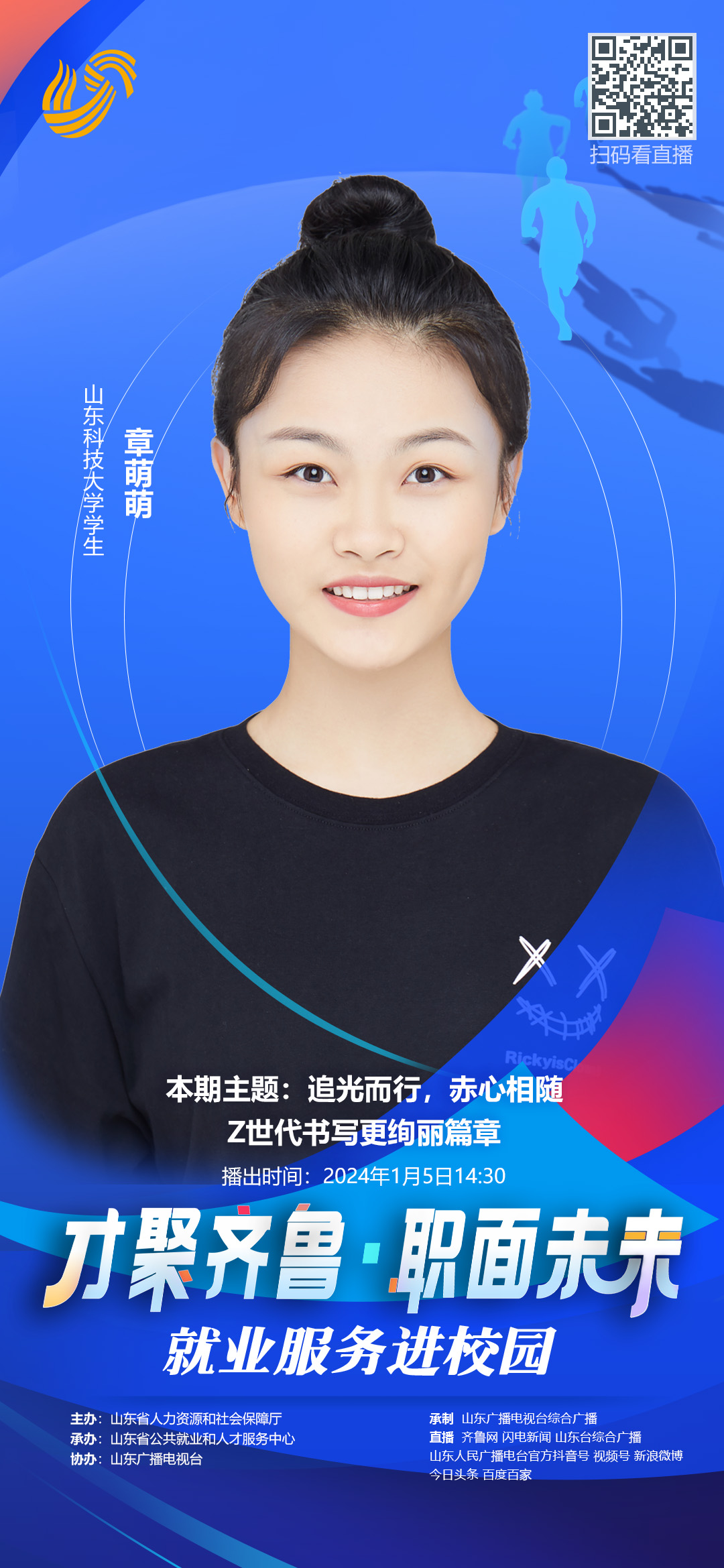 由山东省人力资源和社会保障厅主办、山东省公共就业和人才服务中心承办、山东广播电视台协办的“才聚齐鲁•职面未来”公益就业指导直播课将于1月5日14:30播出。304永利集团官网入口新能源材料与器件专业2024届毕业生章萌萌受邀做客直播间,进行“追光而行,赤心相随——Z世代书写更绚丽篇章”主题分享。这次直播课将深入探讨在职场中面临的挑战,以及如何勇敢迎接未知。章萌萌将分享她和身边朋友们在求职、成长过程中的心得,与您共同思考在竞争激烈的现实中如何闪耀光芒,书写自己的职业传奇。