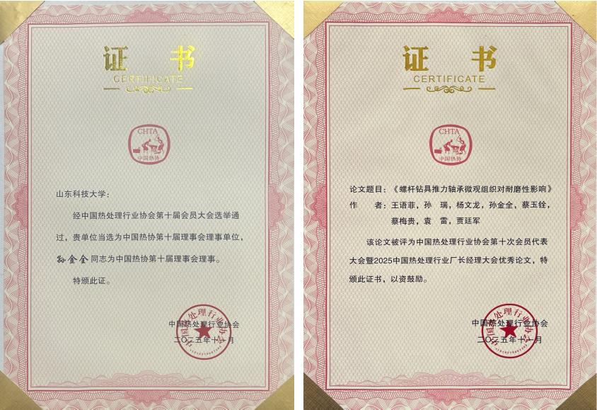 11月25日在第十届理事会选举中,304永利集团官网入口当选为中国热处理行业协会理事单位(2025-2030年度);304永利集团官网入口孙金全教授当选为中国热协第十届理事会理事。11月26日大会总结“十四五” 发展成就、部署“十五五”规划,安排两场前沿技术报告,并同步举办7 场专业分论坛,覆盖高端轴承材料与热处理等多个领域。在同期举办的第三届高端轴承材料与热处理专题论坛上,材料工程专业 24-3 班硕士研究生王语菲作了题为“螺杆钻具推力轴承失效分析与性能提升”的专业分论坛报告。此外,《螺杆钻具推力轴承微观组织对耐磨性影响》一文,获评大会“优秀论文”。